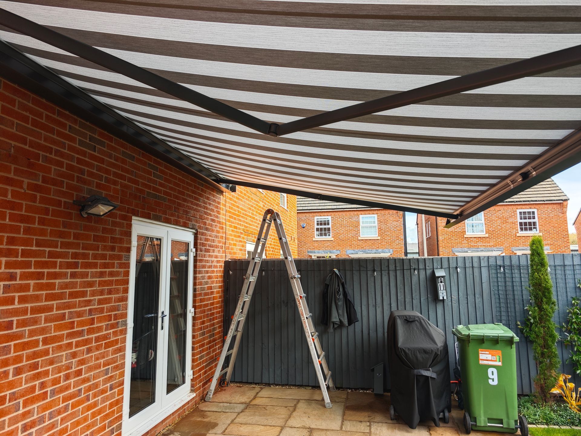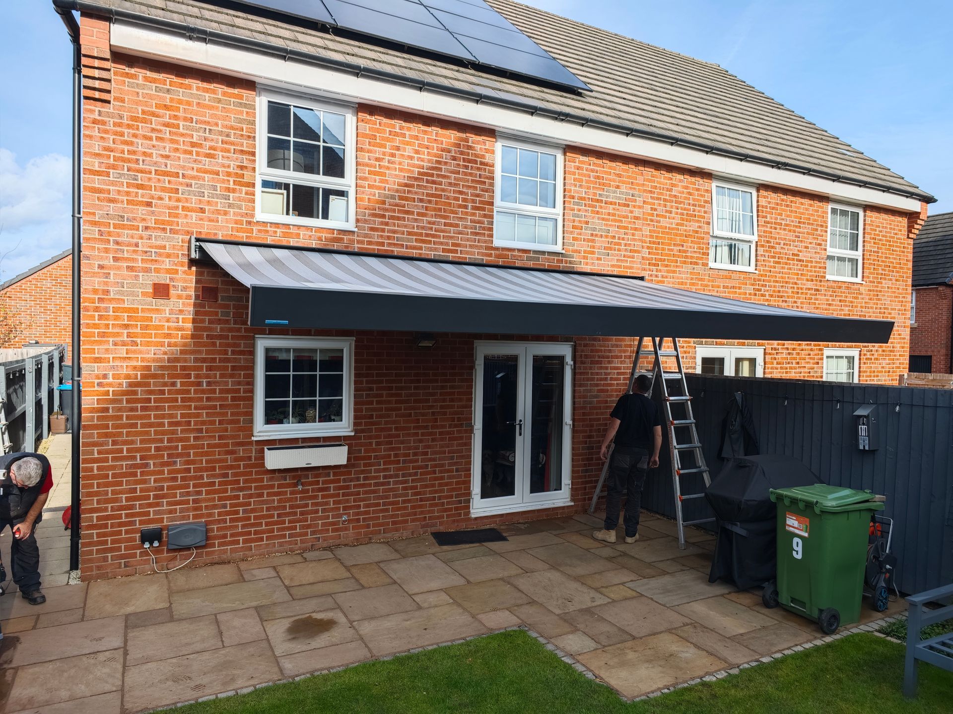 Weinor Kubata patio awning installed in Northwich. The awning was purchased to act as a sunshade for the interior and as a covering when the BBQ is used to provide cover for the sun and rain.