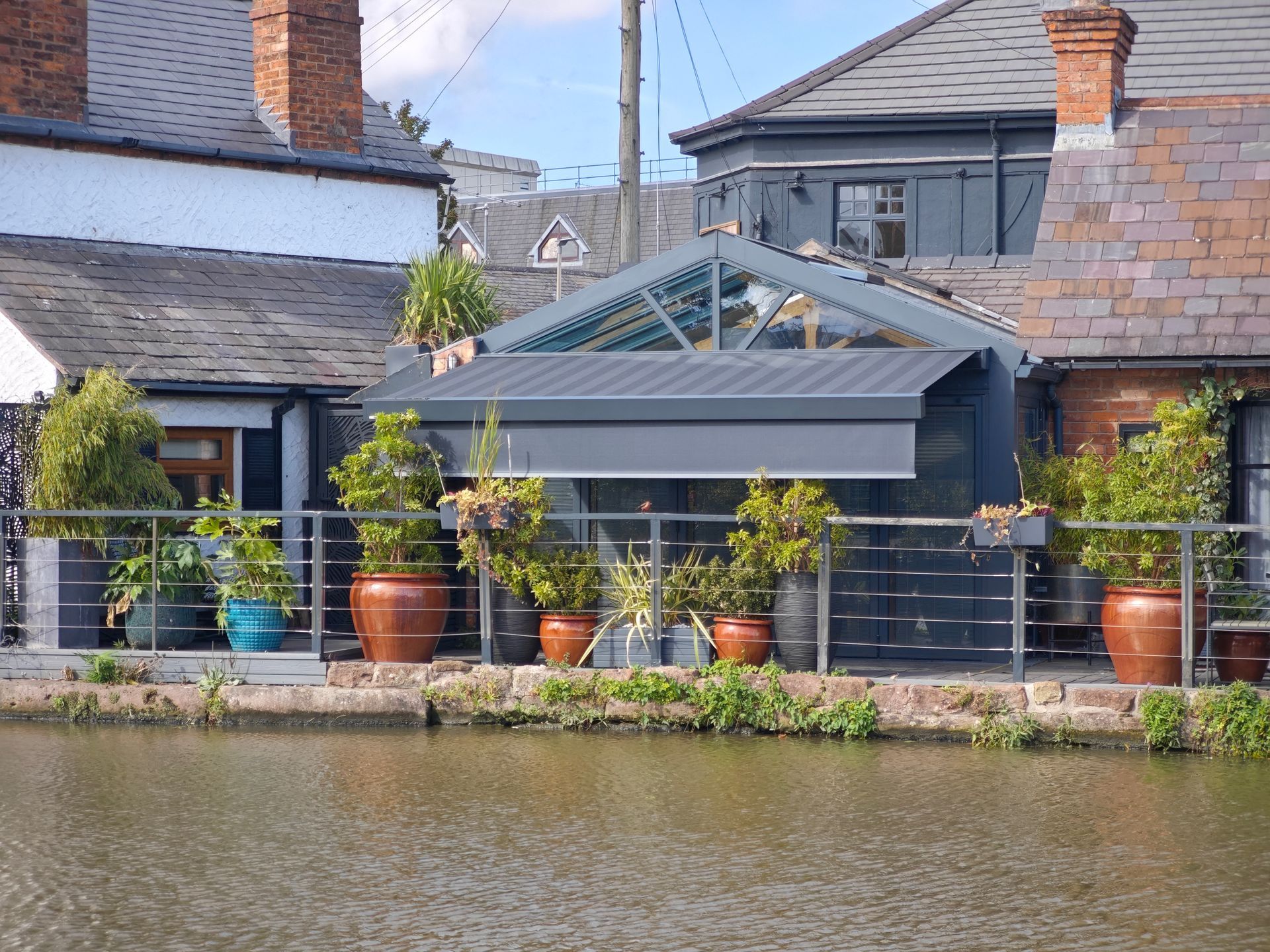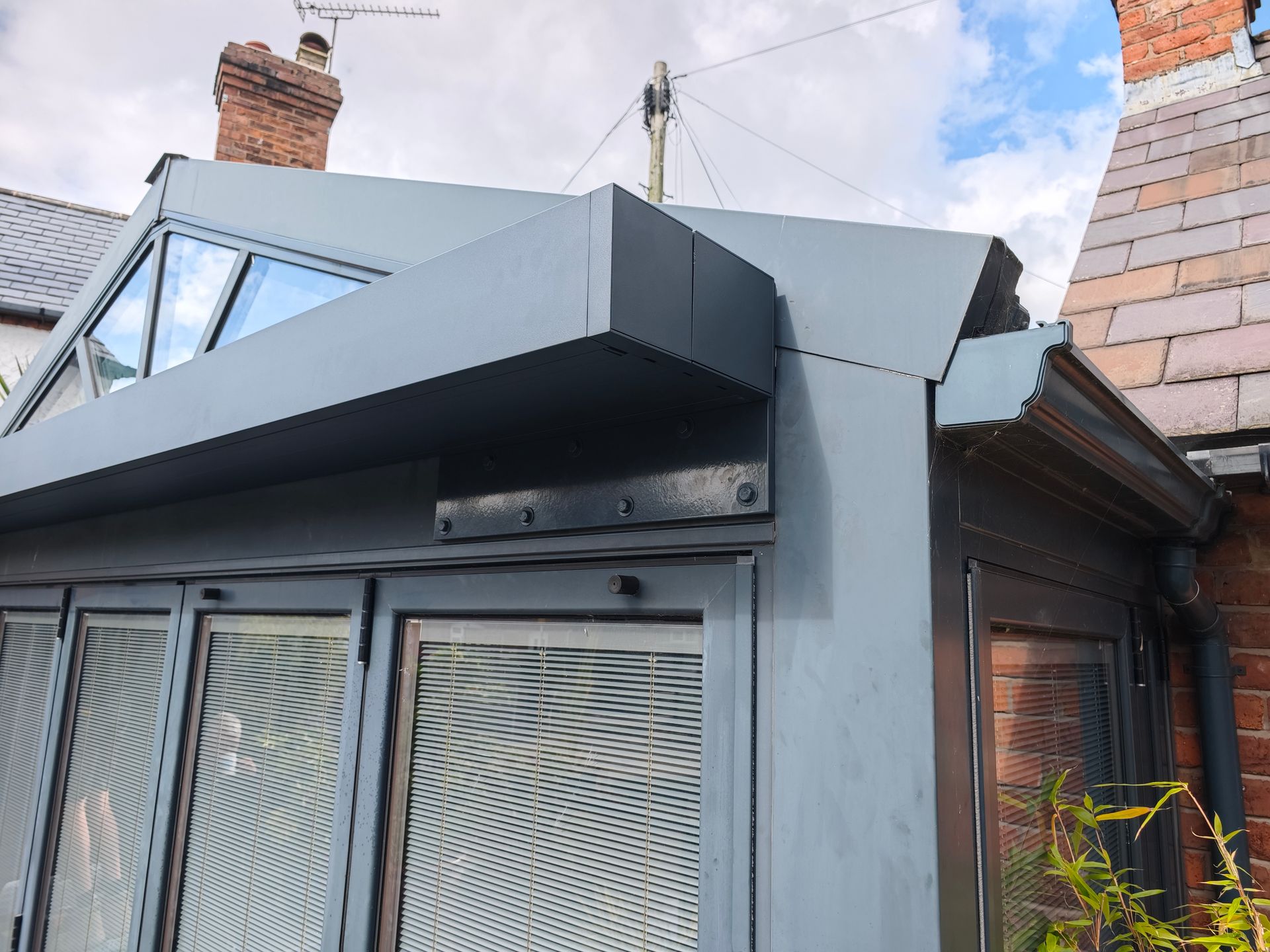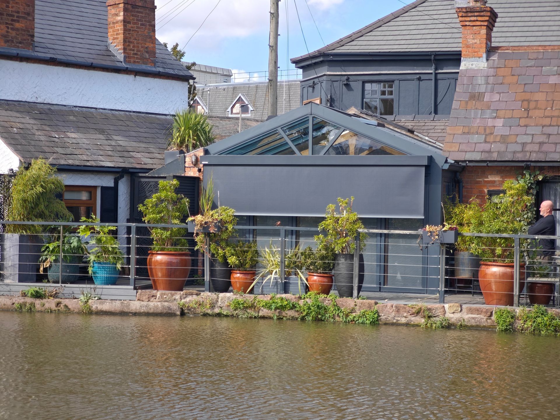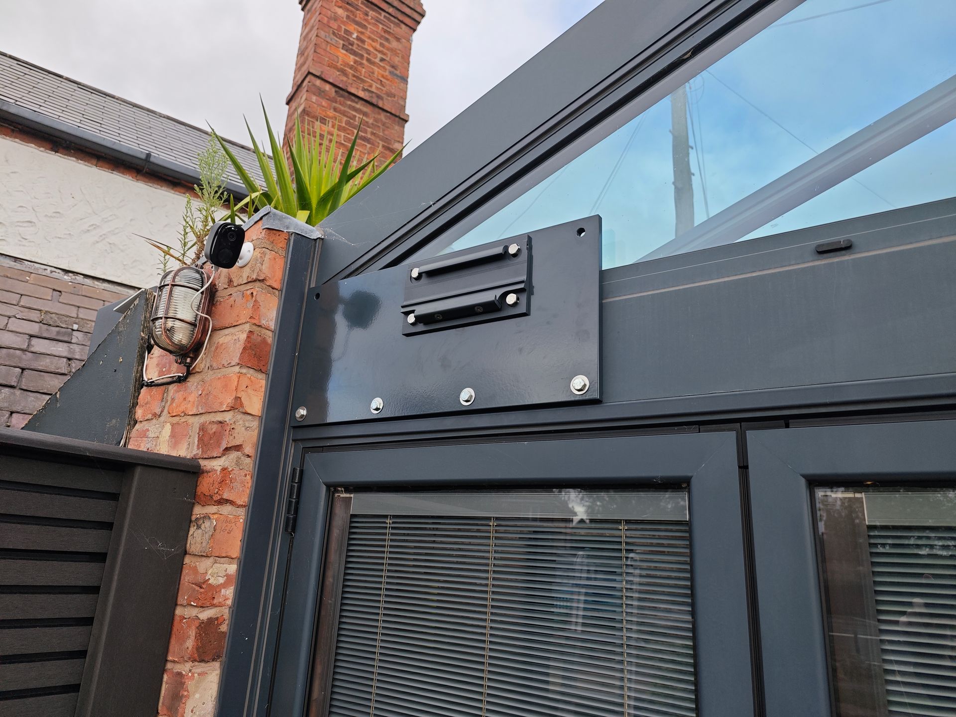 Smaila patio awning 4.2m x 2.1m projection installed onto this Aluminium conservatory in Chester. Special mounting brackets had to be used to provide a solid fixing and raise the awning at the rear to ensure a suitable pitch. The awning provides interior shading and a covered outside sitting area to enjoy the view with the aid of a solar powered drop down blind built into the front profile. Electric operation using a remote control handset and with built in wind sensor.