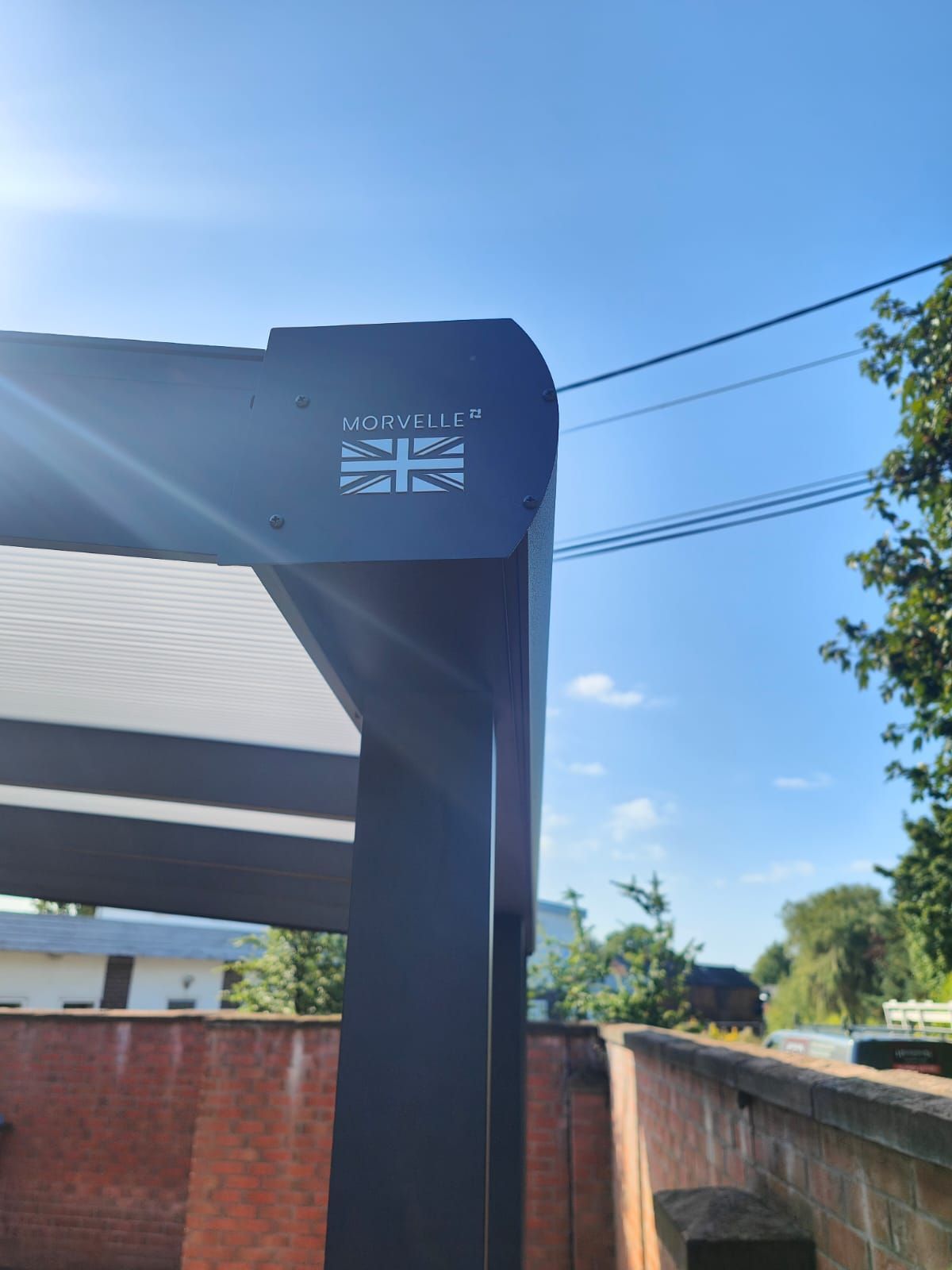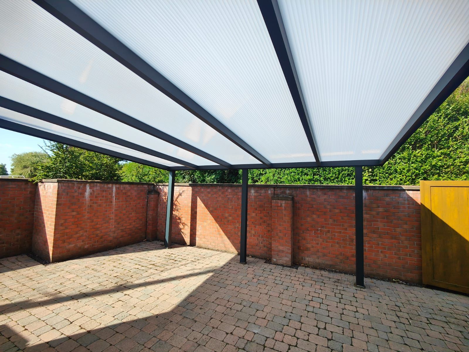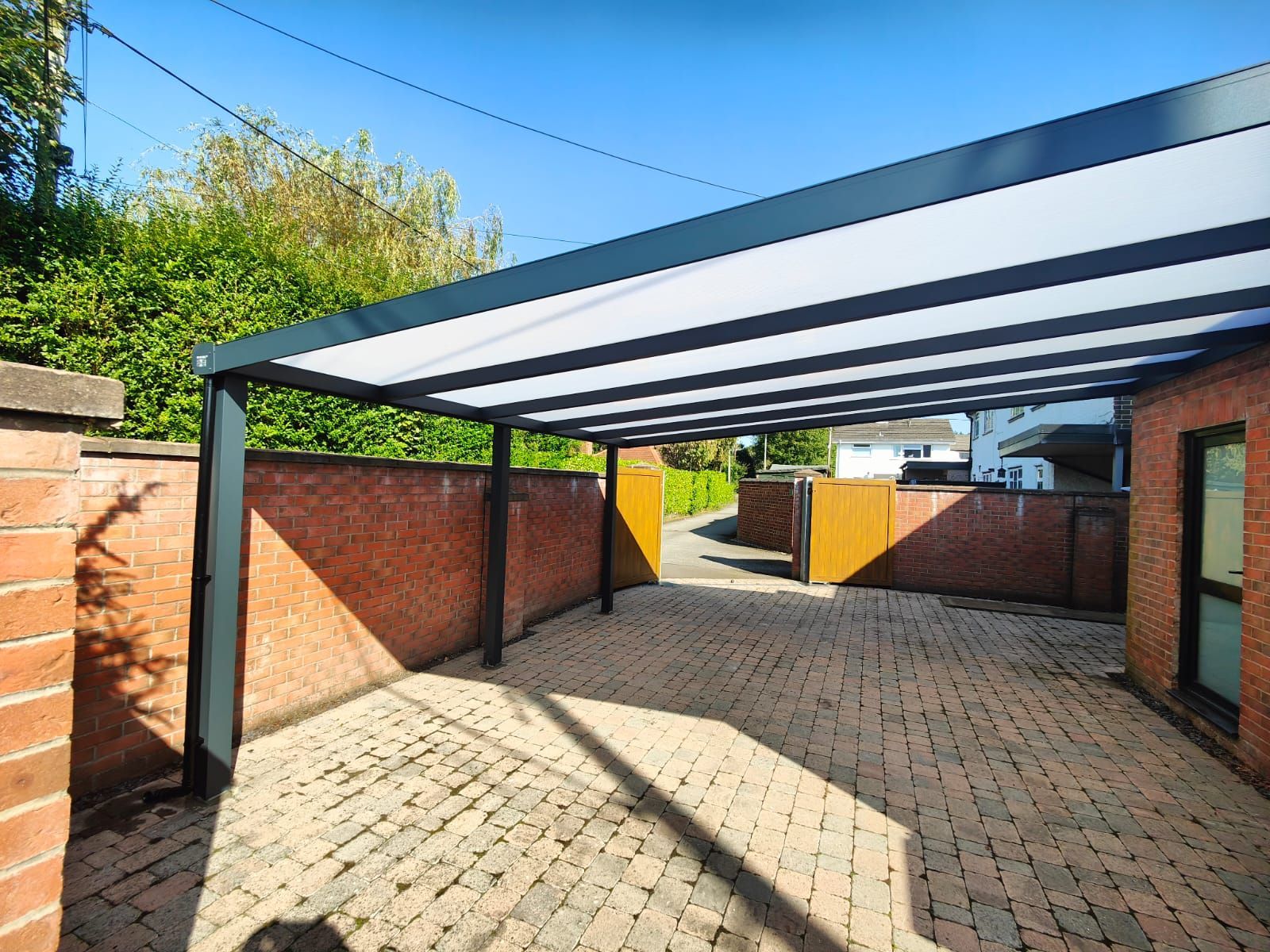 Providing a covered area for two vehicles this Morvelle carport is perfect. 5m wide and 5.5m projection with obscure polycarbonate infill panels supported by aluminium profiles powder coated in a textured anthracite grey. The front profile also acts as a gutter with the water exiting via an external black down pipe (customers request). Normally we have the rain water travelling down the inside of one of the support legs.