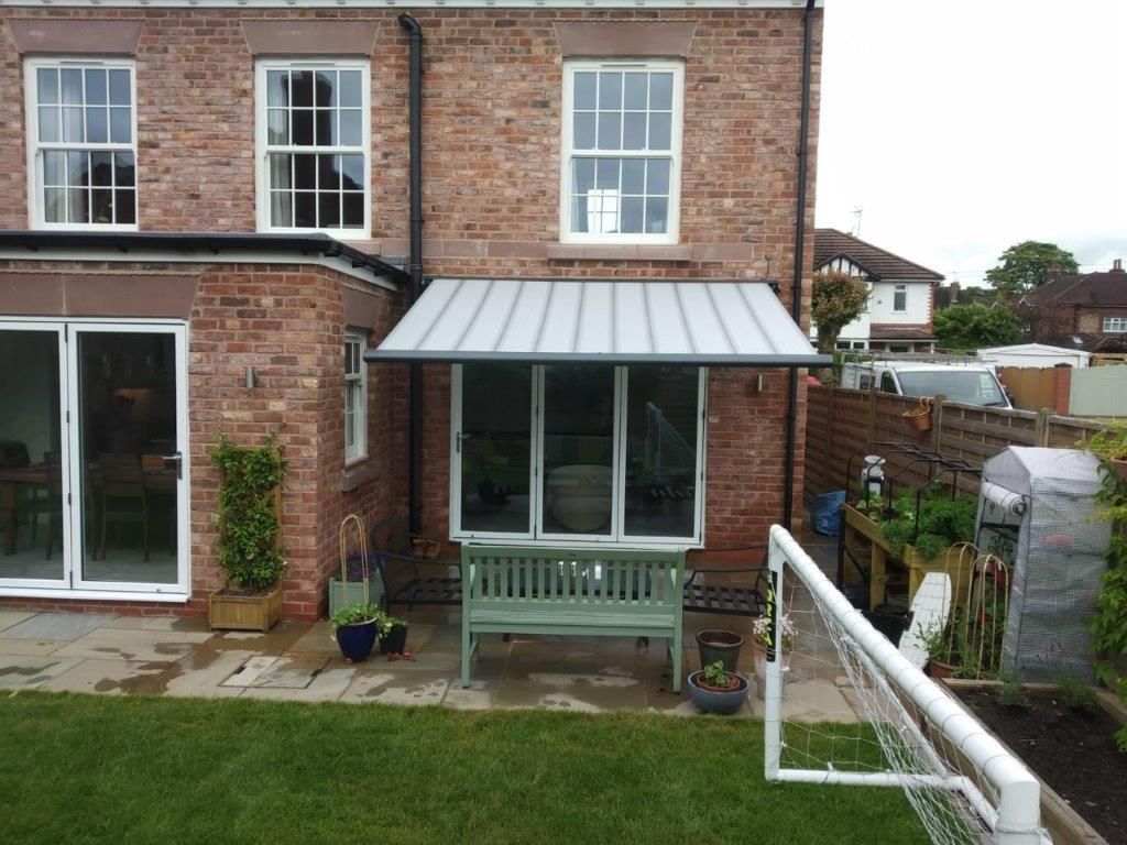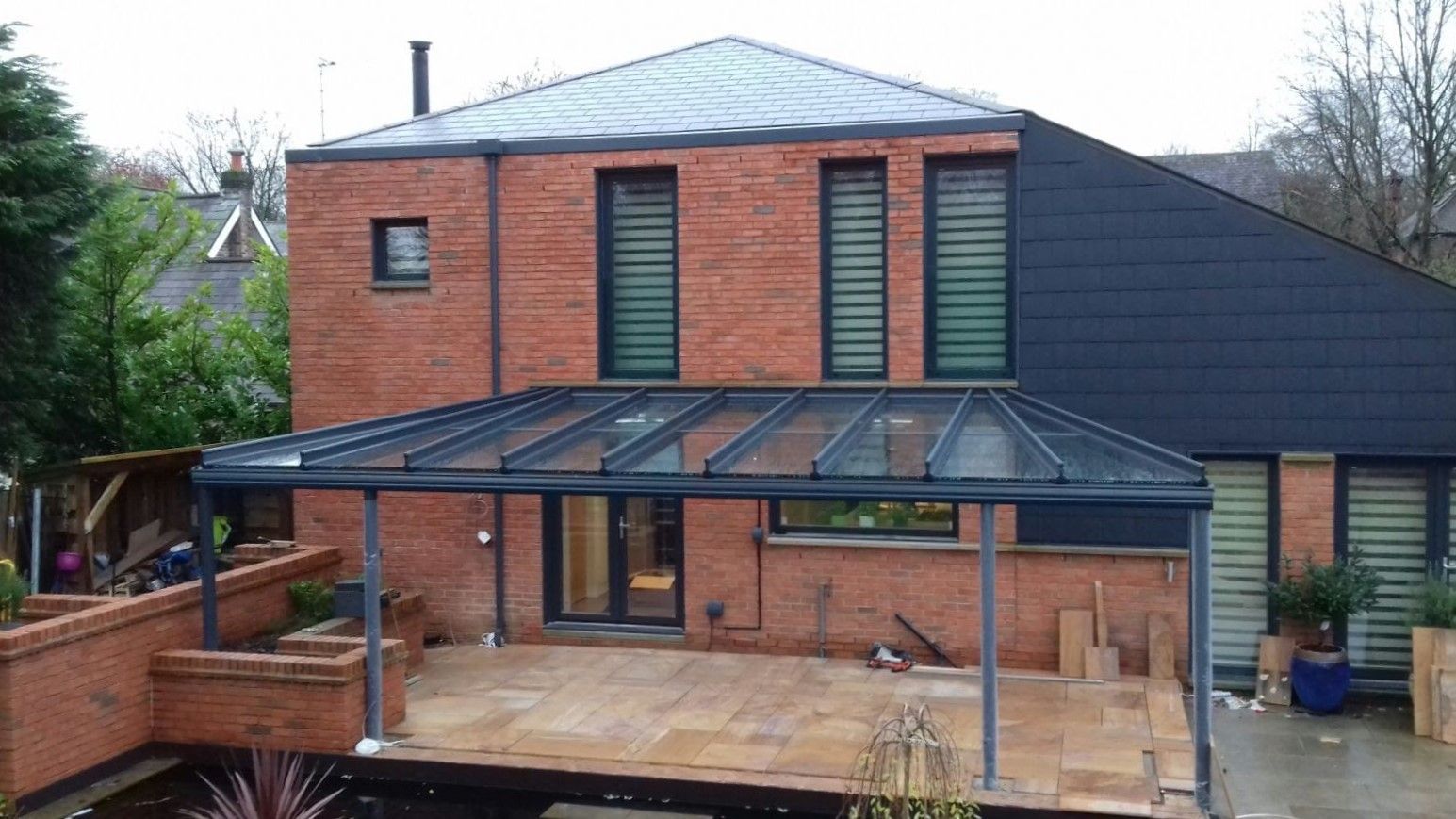 Obscure polycarboante roof inserts with aluminium profiles in marine grade white powder coating. 5m x 3m projection and sealed to the garage to prevent water ingress.
