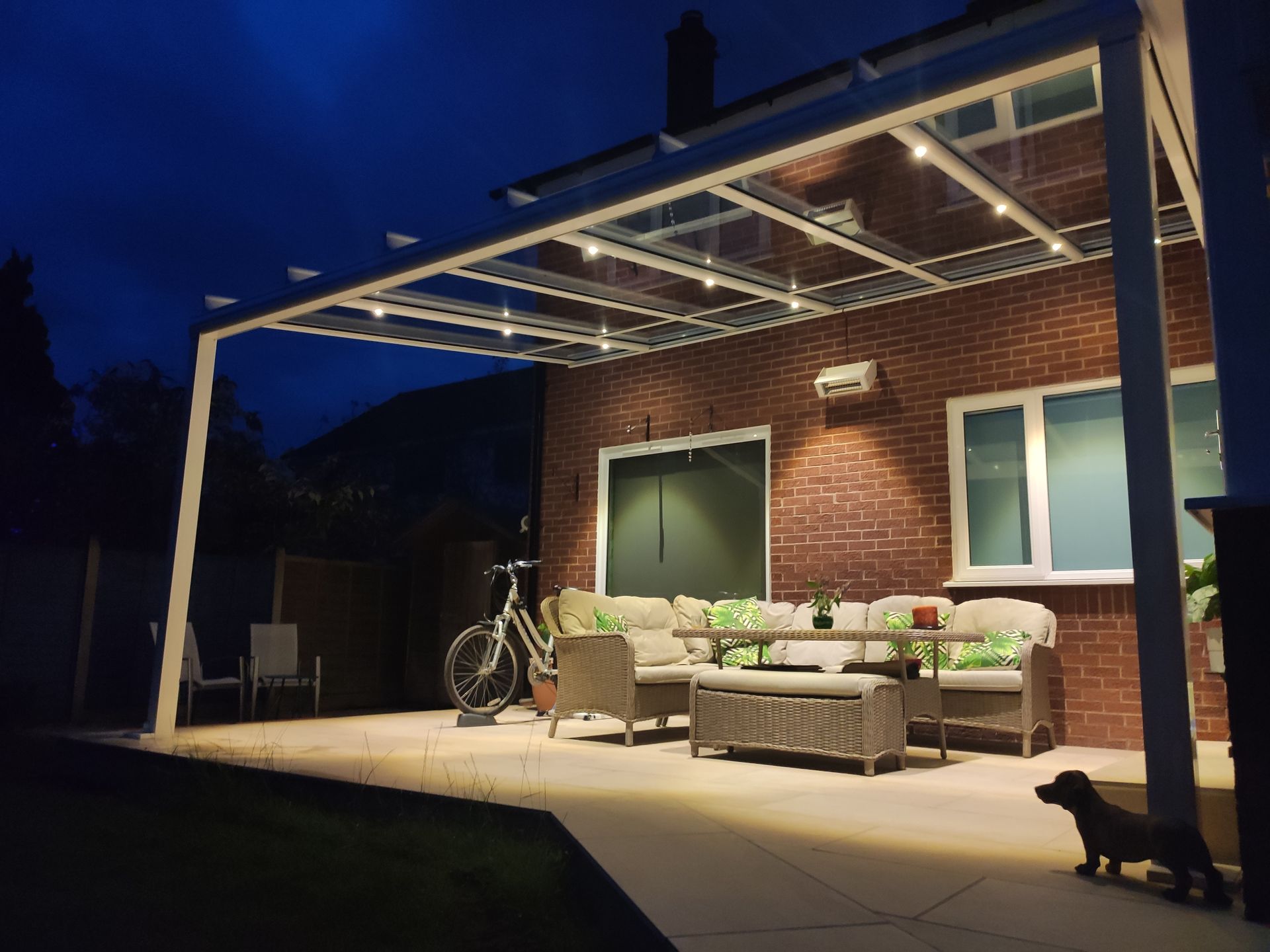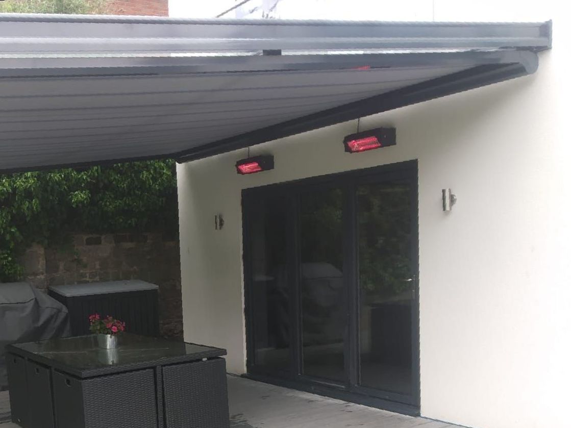 5.5m x 3.6m projection Terrazza glass veranda with LED lights and Tempura infra-red heater to enjoy those evenings outside.