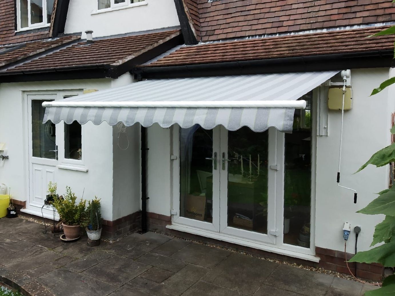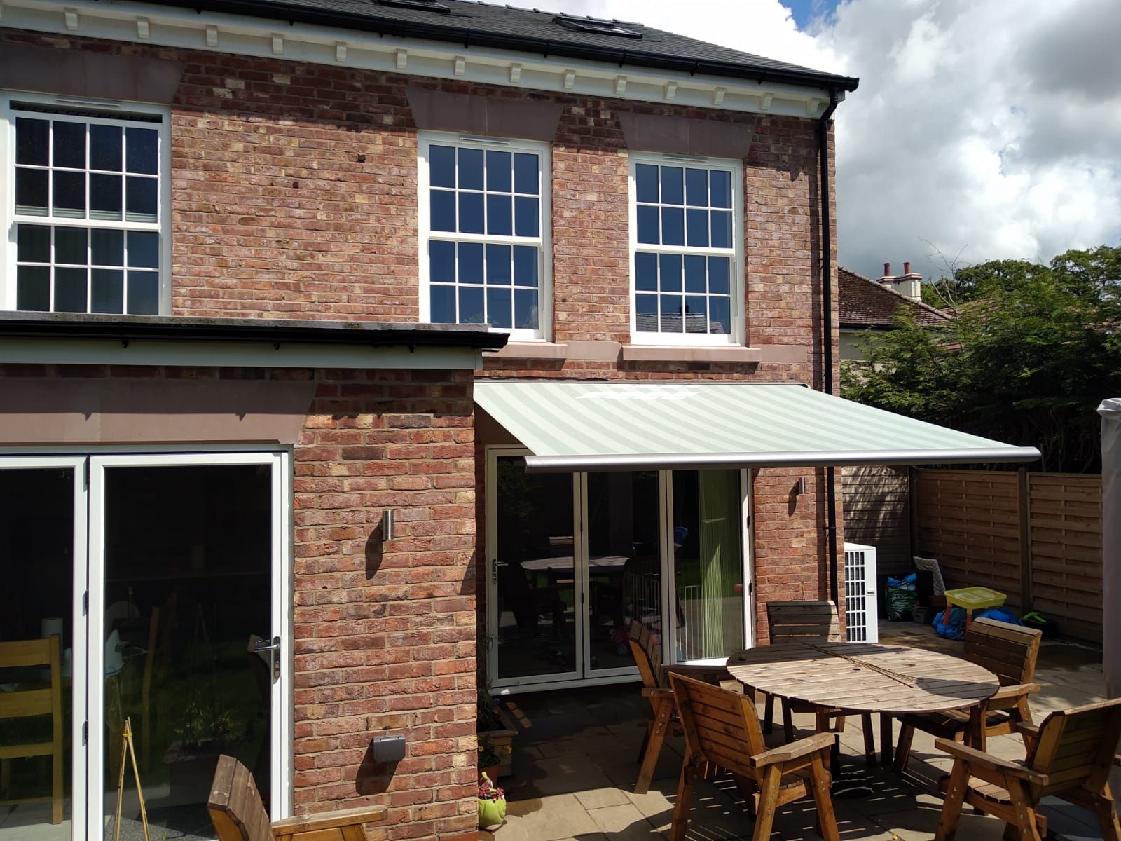 3.5m x 2.5m projection awning with wind sensor. Finished in Anthracite grey for hardware and matching striped acrylic fabric.