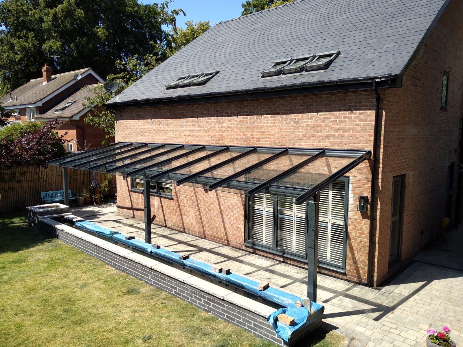 6m x 2m projection glass veranda with 6mm toughened glazing in blue tint, LED lighting and marine grade anthracite finish. Mounted to aluminium plate installed onto fascia.