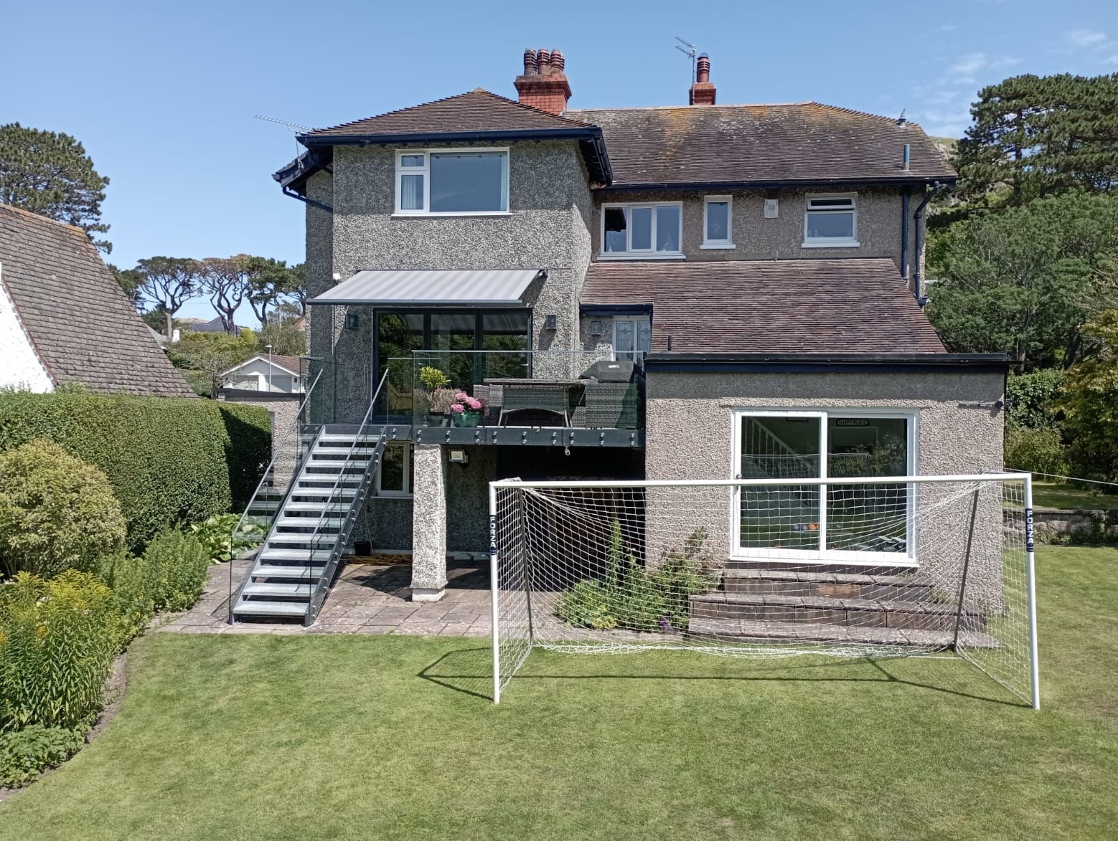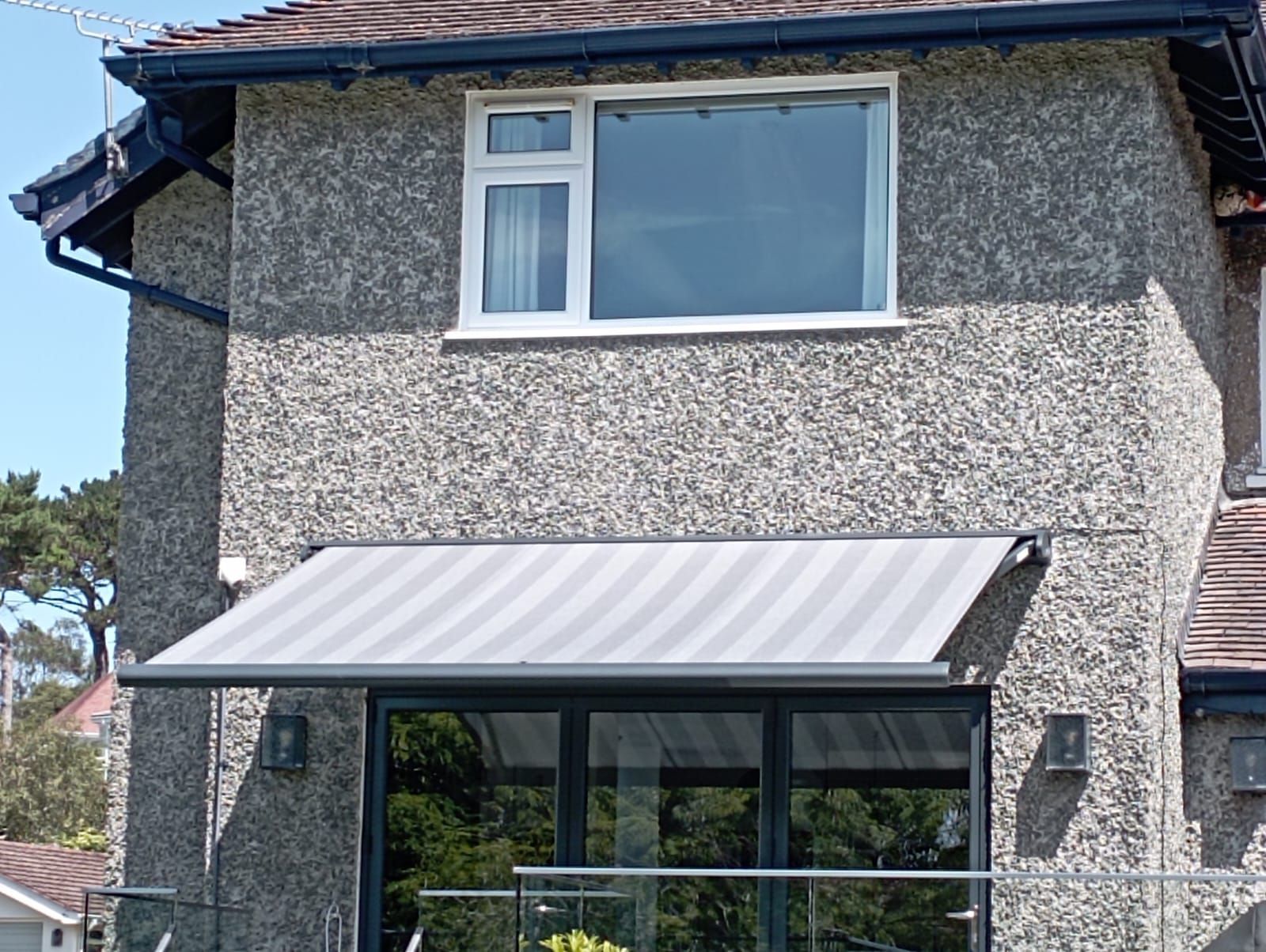 Cassita patio awning 3.5m x 2.5m projection installed onto this raised balcony in Deganwy North Wales. The awning provides interior shading and a covered outside sitting area to enjoy the view. Electric operation using a remote control handset and with built in wind sensor.