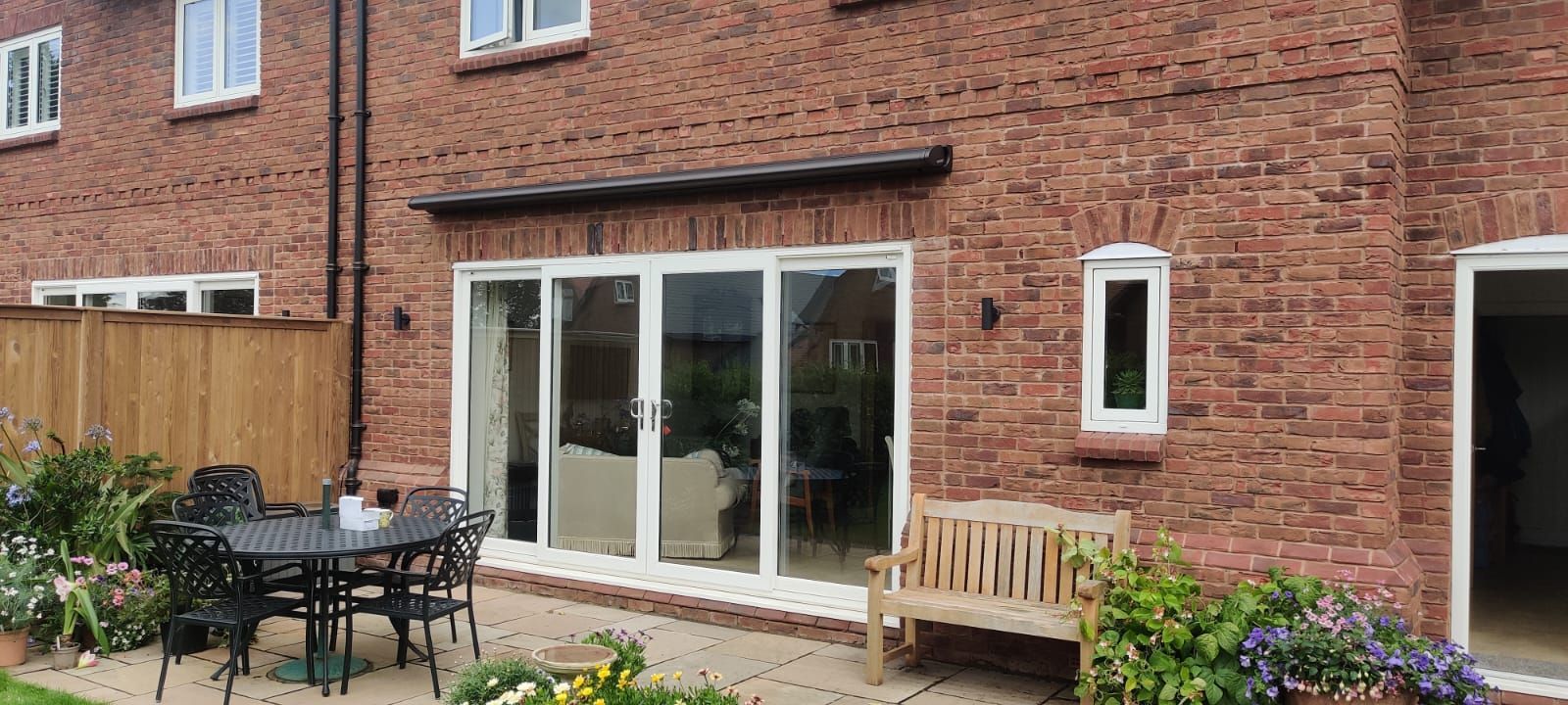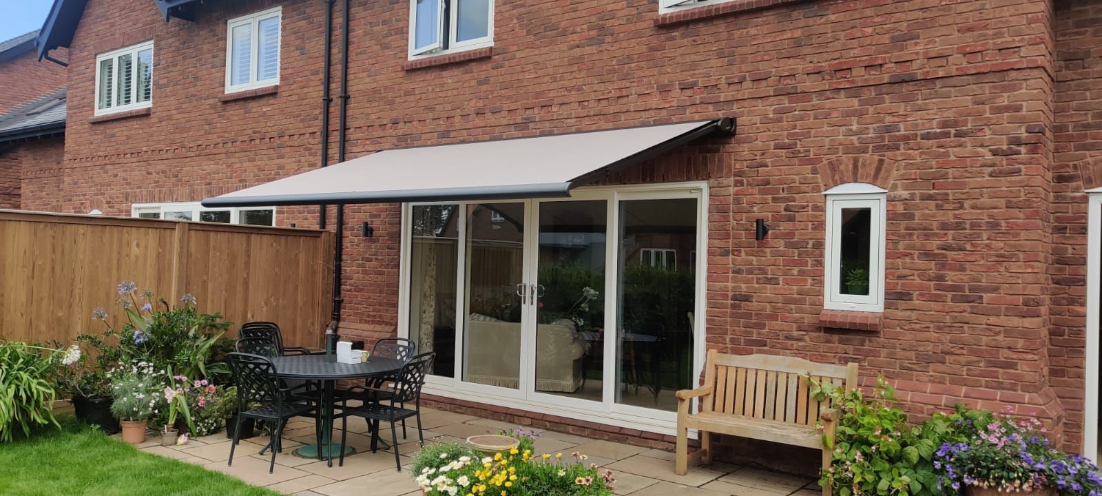 Installed in the picturesque village of Burton on the Wirral. The awning was primarily purchased to provide internal shading for the kitchen and dining area but doubles up as a lovely patio shading solution. Operated by remote control which works inside and outside the property and protected by a hidden wind sensor in the front profile should the weather change.