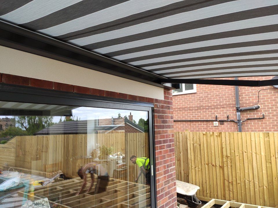 Installed in Frodsham, Cheshire this Weinor Kubata awning was chosen for it's sleek modern angular housing to complement the customers new extension and decking area. Operated by remote control with a built in Somfy motor the awning is also controlled by the customers mobile phone utilising the Somfy Tahoma Switch interface.